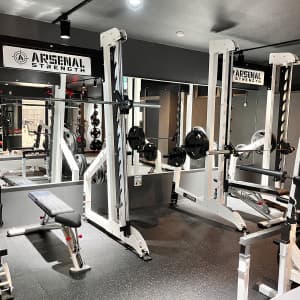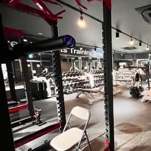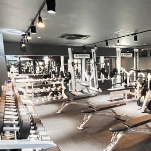 ダンベルは60kgまで完備。パワーラックが3台、スミスマシンが2台あるため、